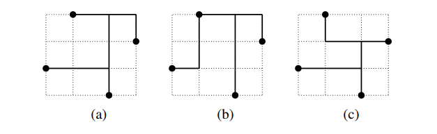 注意,如果一个 wirelength vector $\boldsymbol{w}$ 偏序(i.e. 每一维都大于等于,其中至少有一维严格大于)了另一个 wirelength vector $\boldsymbol{w}’$,那么 $\boldsymbol{w}$ 对应的 Steiner tree 永无可能成为最优的 Steiner tree。比方说此处的 $(a)$ 状的树,无论如何都不可能是最优的 Steiner tree。一切不偏序其他向量的 wirelength vector 即可能产生最优的 Steiner tree 的向量称作 potentially optimal wirelength vector (POWV),对应的 Steiner tree 称作 potentially optimal Steiner tree(POST)。