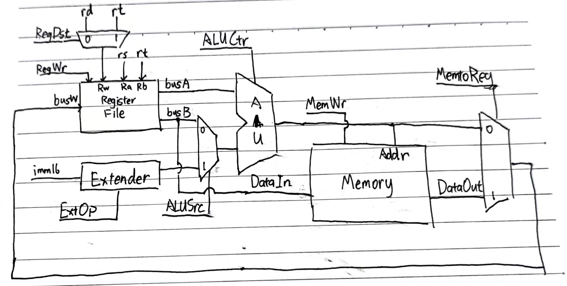 rs和rt,写rs或rt。因此,需要两个读口一个写口(寄存器编号),一个写使能信号,一个数据接口busW,两个出口busA,busB。 - 存储器. 一个只读指令存储器,一个可读写数据存储器,均为 $32$ 位;因此,需要地址接口,一个写使能信号,一个数据接口