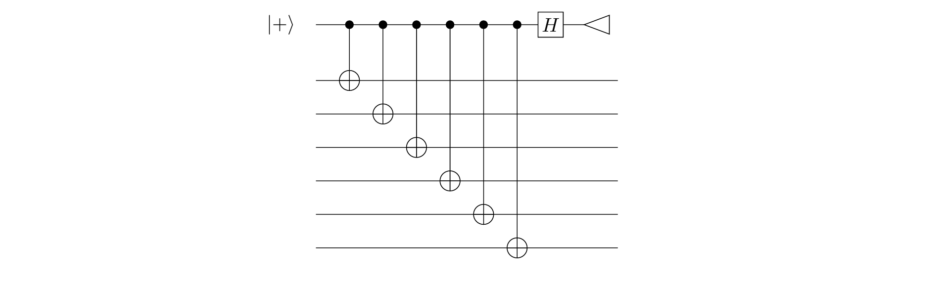对于任意 Pauli 群中的元素,测量一个态是其特征值为多少的特征向量可以用 Phase-Kickback 配合 Controled Pauli Gate 实现。比如你现在要判断一个 $6$-qubit 态 $|\psi\rangle$ 是 $\mathcal{XXXXXX}$ 的特征值为多少的特征向量,可以使用以下电路: