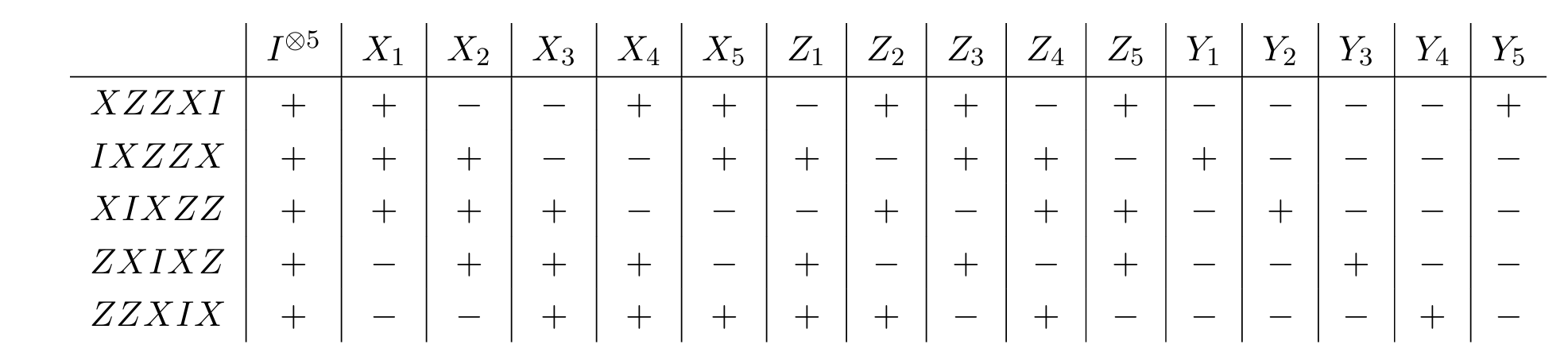 这个码的 Syndrome 如下表所示,因此也能纠正所有的 1 qubit 错误。