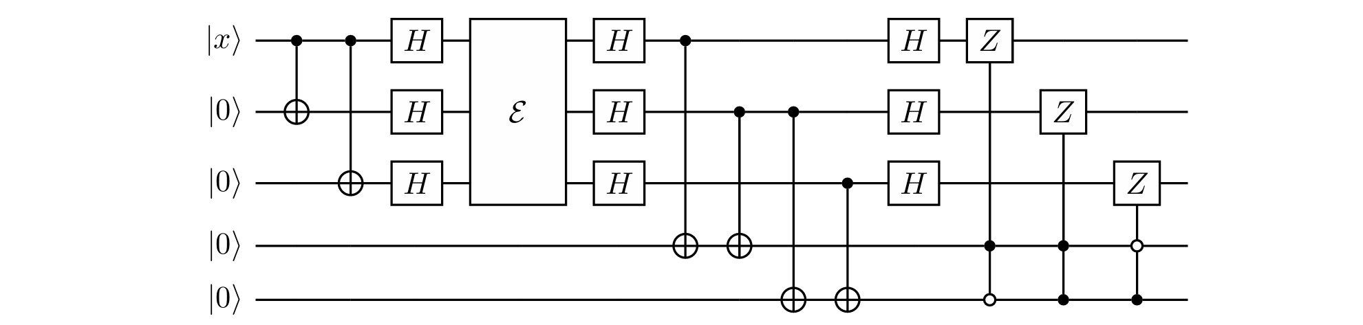 \textsf{Enc}(0) = 000 \quad {\color{lightgray} \text{denoted $0_L$ (the logical $0$)} } \\