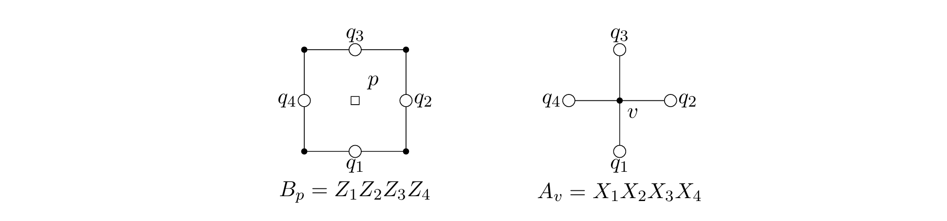 注意 $A_p$ 和 $B_v$ 相互之间都对易,因为其交于 $2$ 点或者 $0$ 点。注意,一个 $X$ error 使得与该 qubit 相邻的两个板检查测出 $-1$ 特征值,一个 $Z$ error 使得与该 qubit 相邻的两个星检查测出 $-1$ 特征值。注意,只有 $X$ 错误连接了两条相对的边的时候,这个 $X$ 错误才属于 $N(S) \setminus S$。因此只需要 $O(d^2)$ 个逻辑比特便可构造码距为 $d$ 的表面码。
