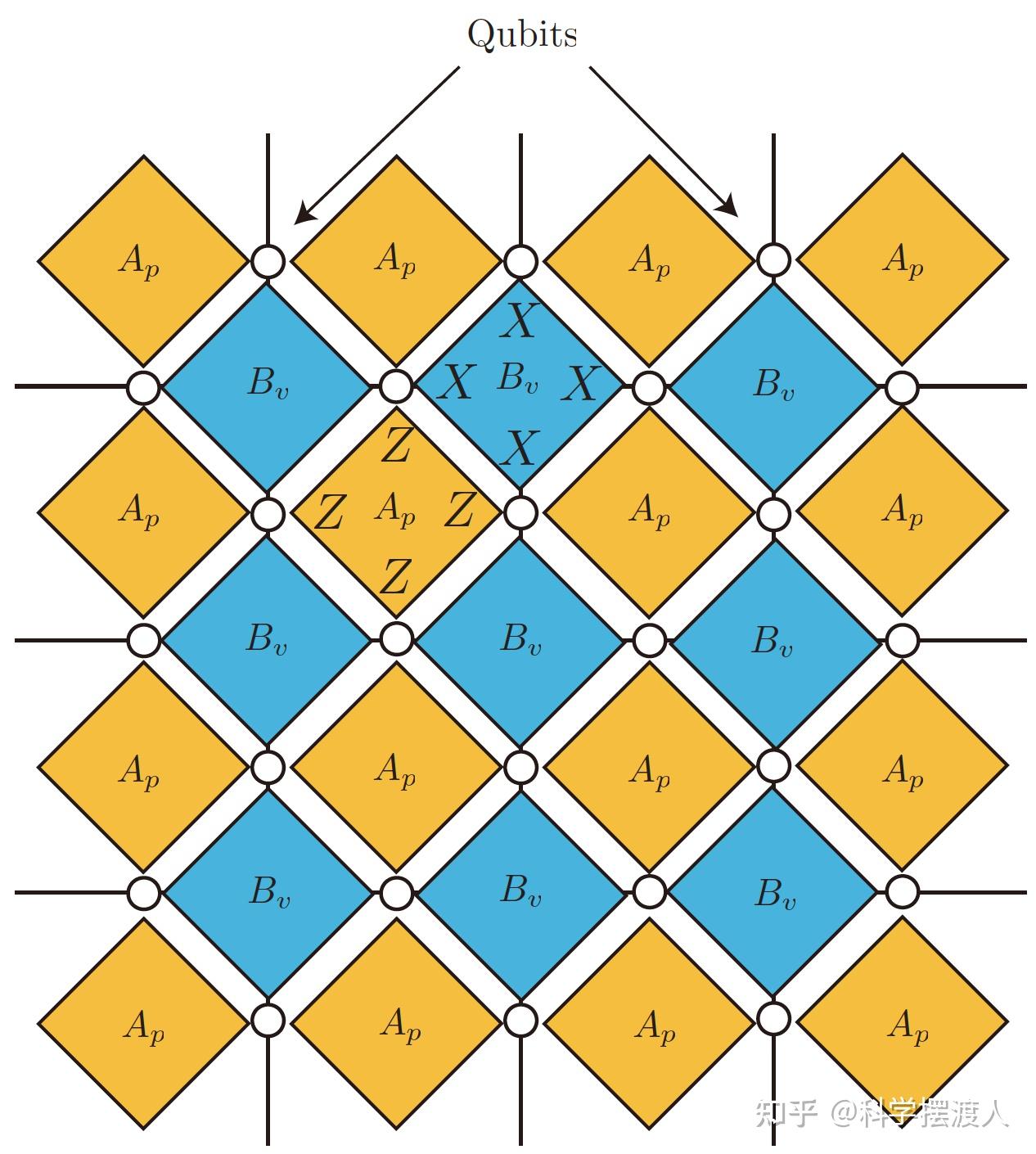 一个表面码被组织成一个 2D 的周期性网格图,格子的每条边上都放置了一个 qubit。引自知乎的下图展示了 Surface Code 的布局: