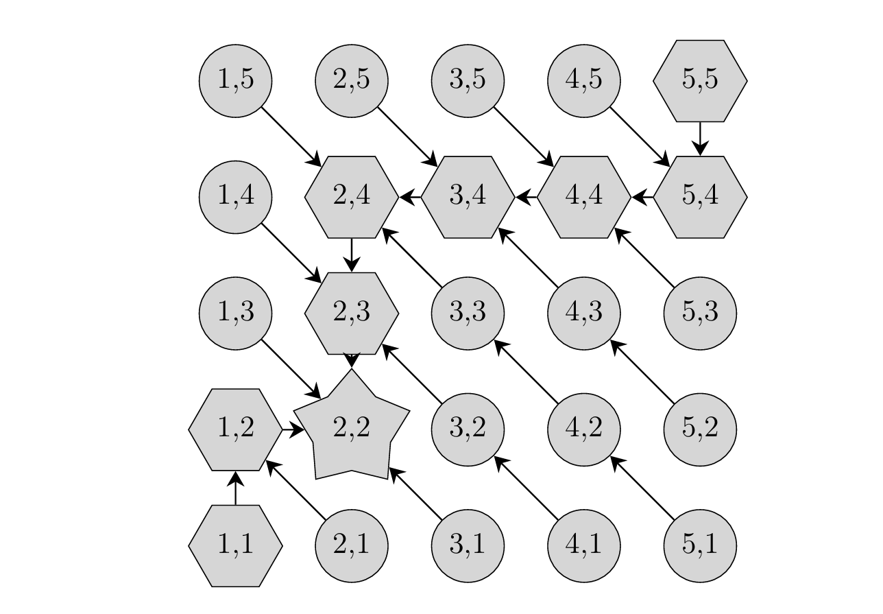 - 对于其余格点,路径上方的指向其右下方,路径下方的指向其左上方。
